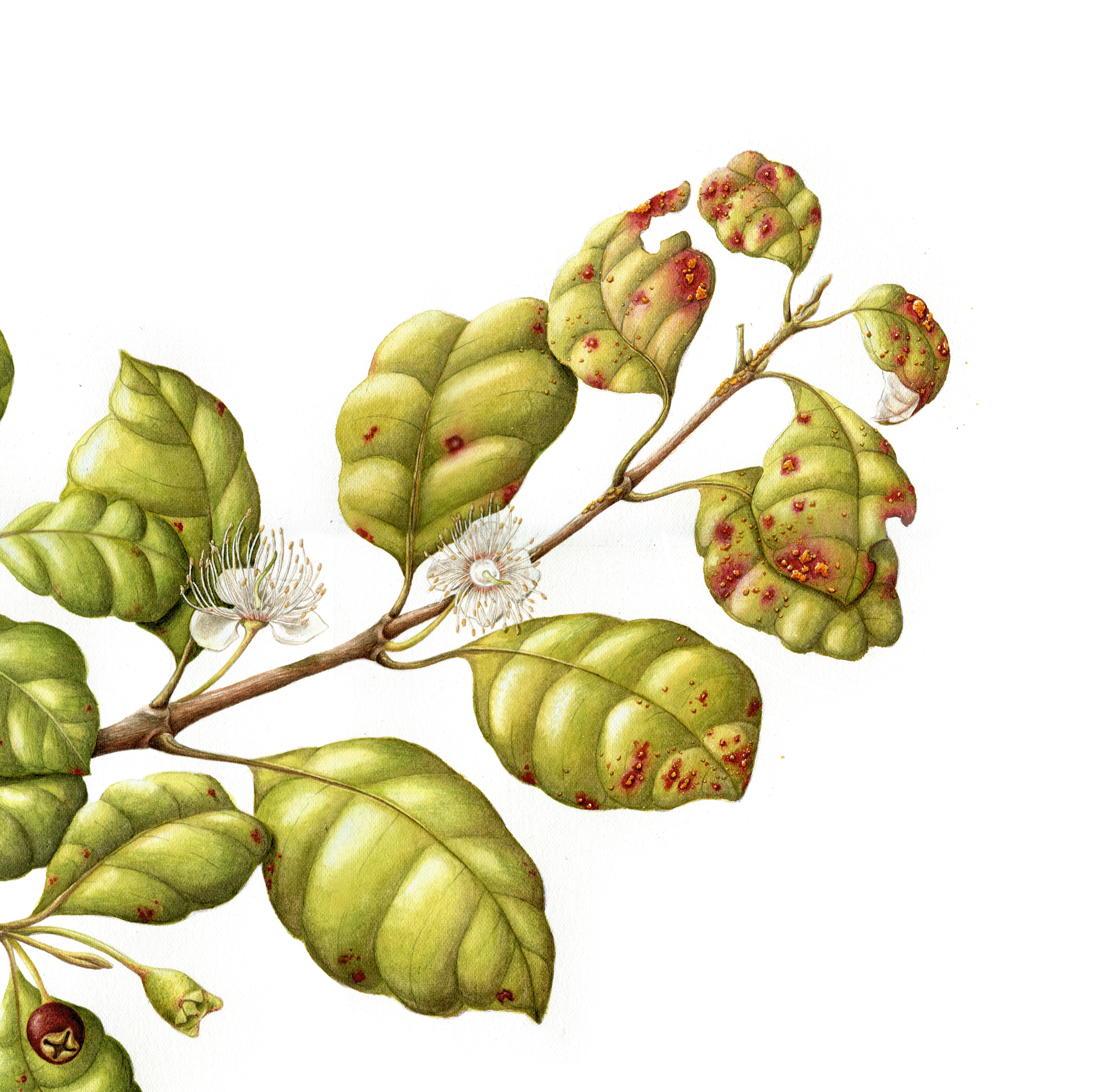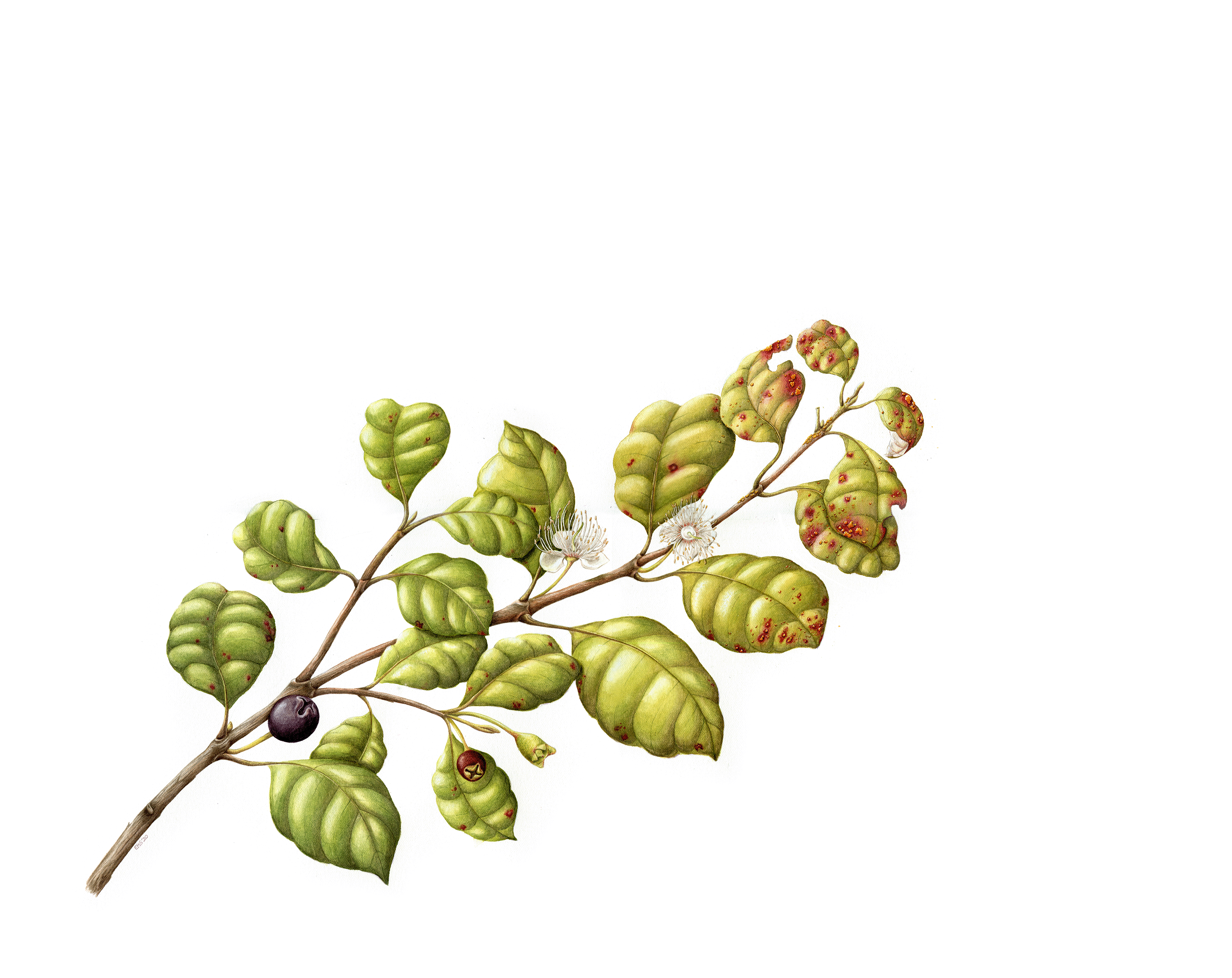 Ramarama (Lophomyrtus bullata) exhibiting characteristic signs of myrtle rust (Austropuccinia psidii).