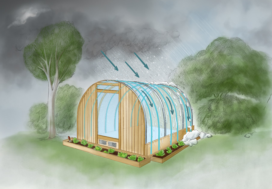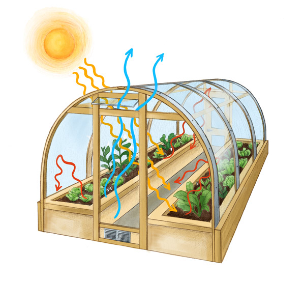 How the 'Living Room' traps heat from the sun to create an environment to grow vegetables (pencil + digital)